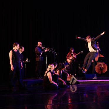 First premiering in 2022, WHODUNIT? has seen great success, and has become a well known and beloved show within our community. Created by Kathleen Doherty, featuring live jazz music composed by Andrew Jackson, the show is a twist on a classic murder mystery. The movement is rooted in Jazz dance, with rhythm, connection, groundedness, and a major sense of ensemble between the entire cast of dancers & musicians. With laughs throughout, the cast takes audiences on a journey to solve the mystery, while accusing one another along the way.